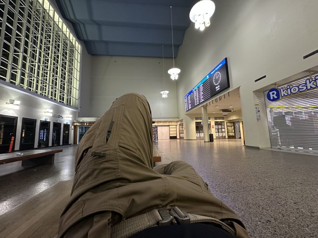 Tällä kertaa ei sentään tarvinnut potkia useampaa tuntia renkaita Rovaniemen prismassa pierun hajuisena, vaan kun kaverini Tommi asustelee tällä hetkellä kylällä, luvassa oli suihku, sekä burgeri & kalja. Tutulla klo 2100 lähtevällä junalla kohti Tamperetta ja aina ihanaa 0530 herätystä.