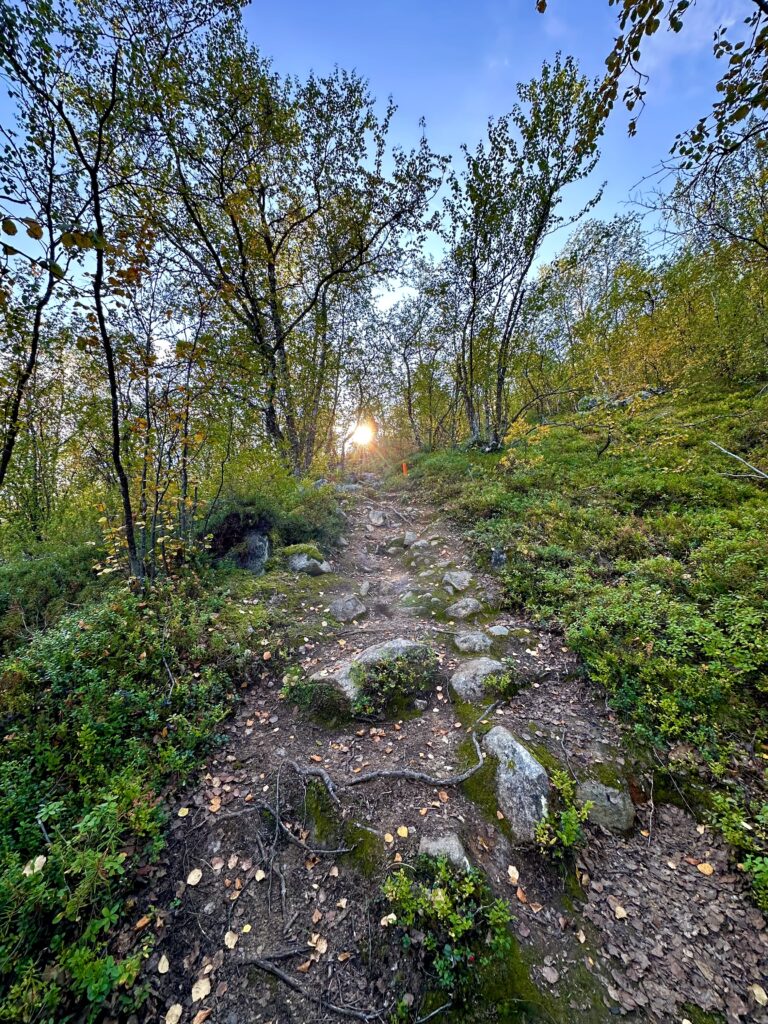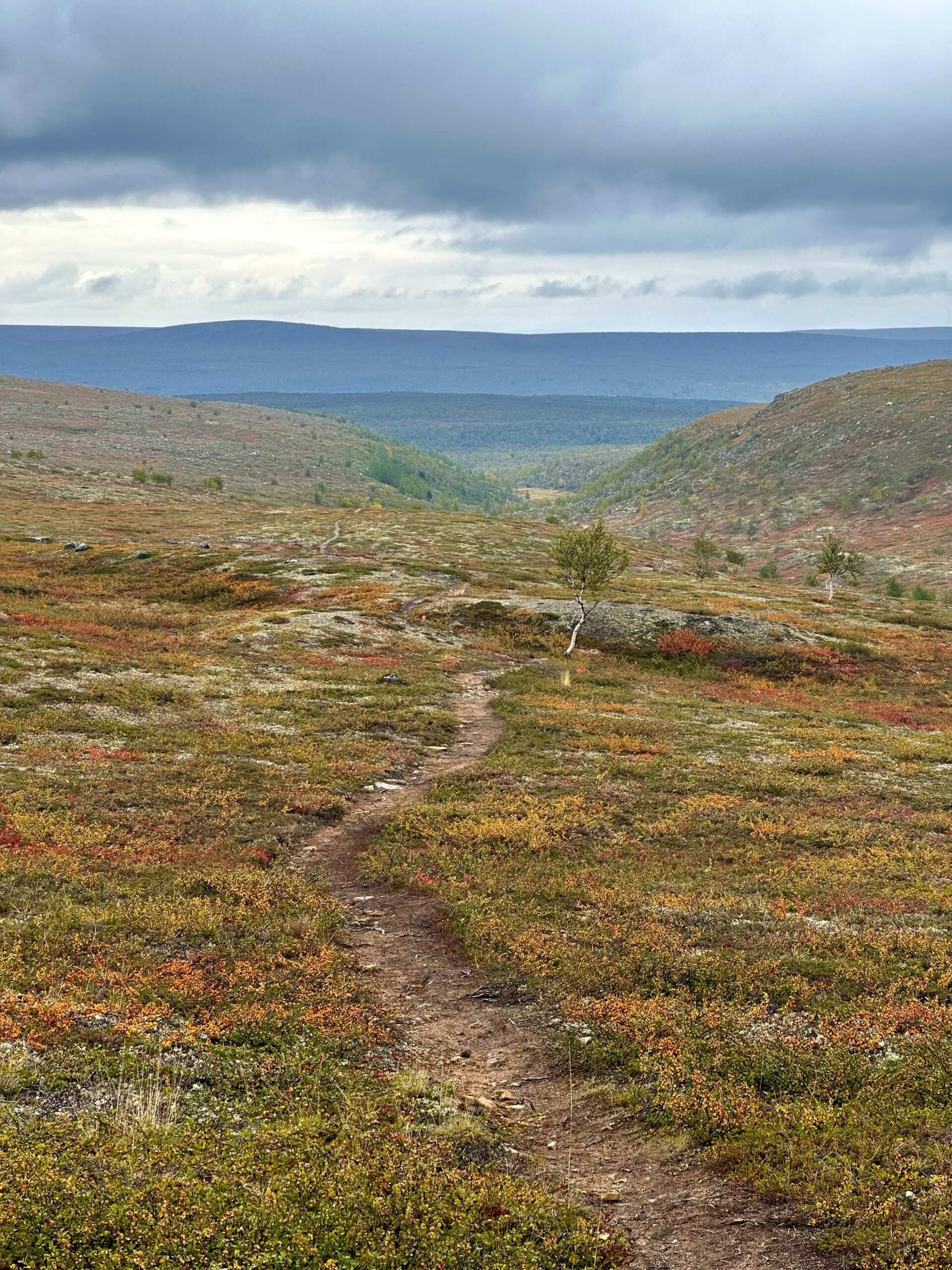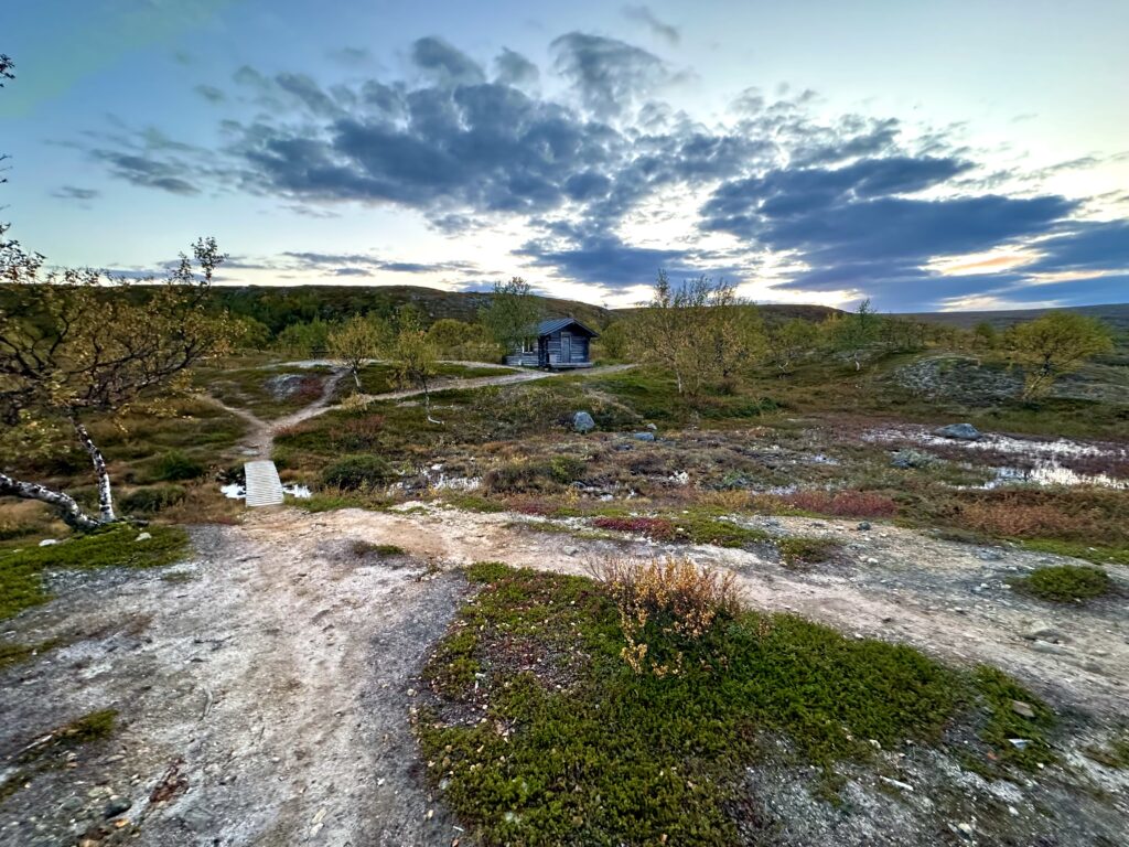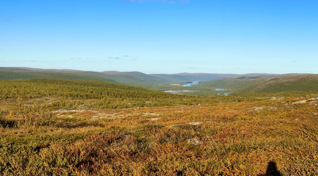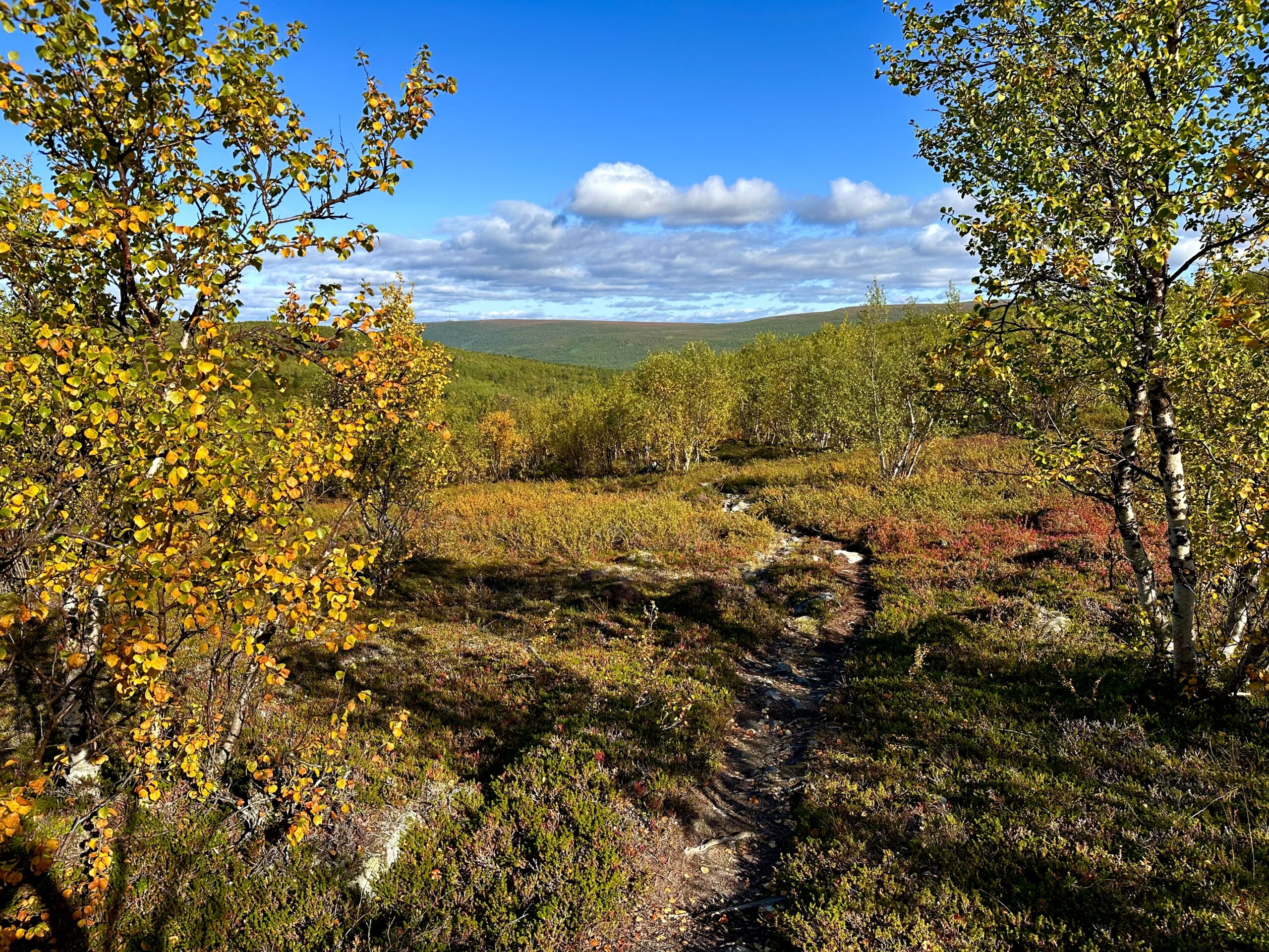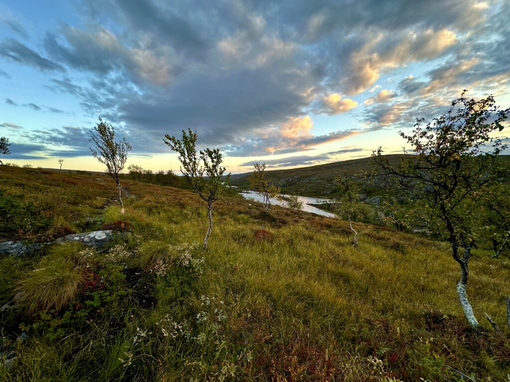 Noin tunnin tauon jälkeen jatkoin viimeiset 5km kodalle, jossa olisin viimeisen yön. Reitti nousi Vuolleseavttevárrin huipulle. Tuolta näkyi pitkälle Norjaan ja Tenojokea. Pieni juomatauko ja horisonttiin tuijottelua ja matka jatkui alas ja taas seuraavan matalamman tunturin kautta koivikkoon ja kohti kotaa, jonka jo viimeisimmän huipun päältä näki.