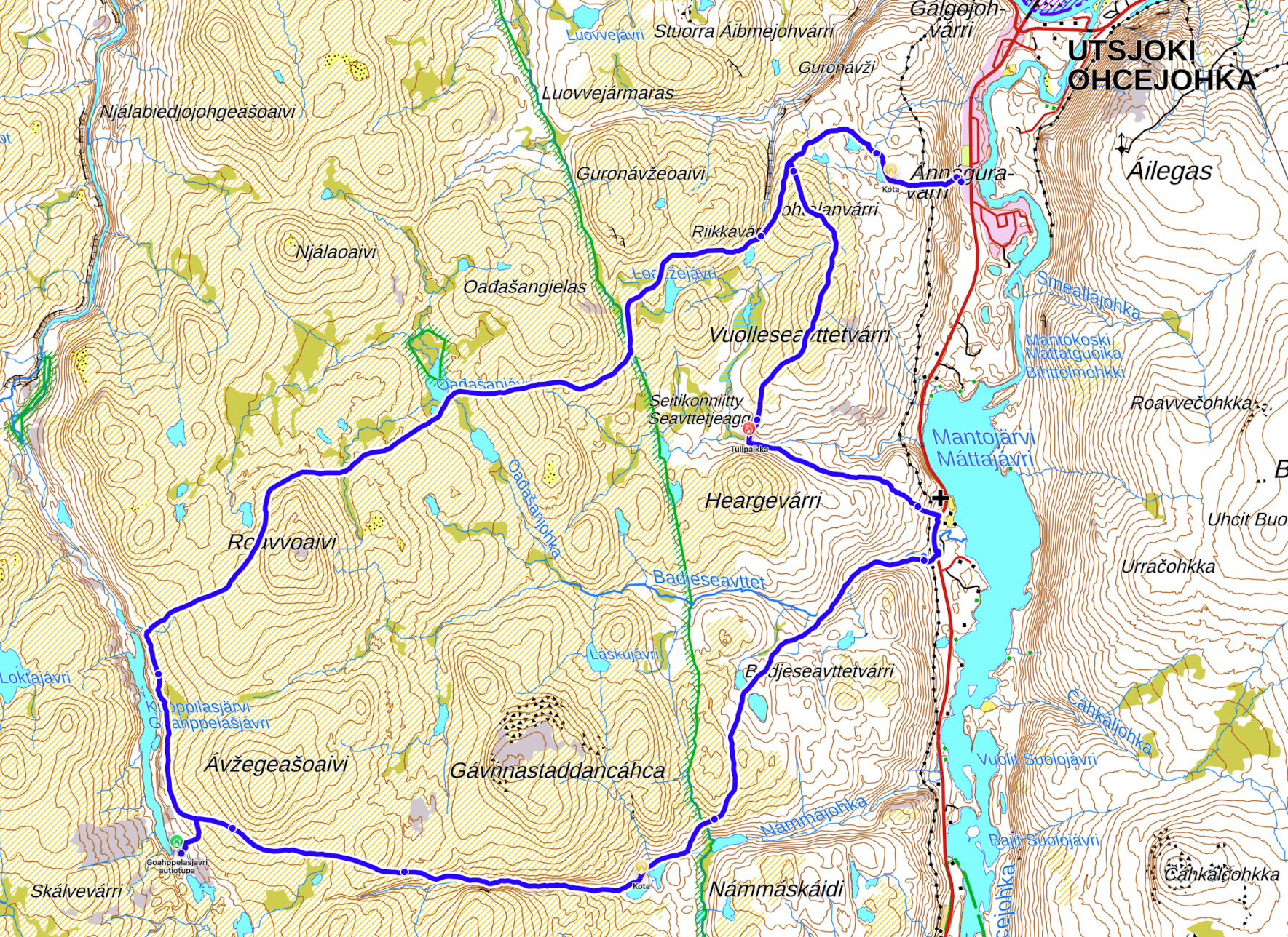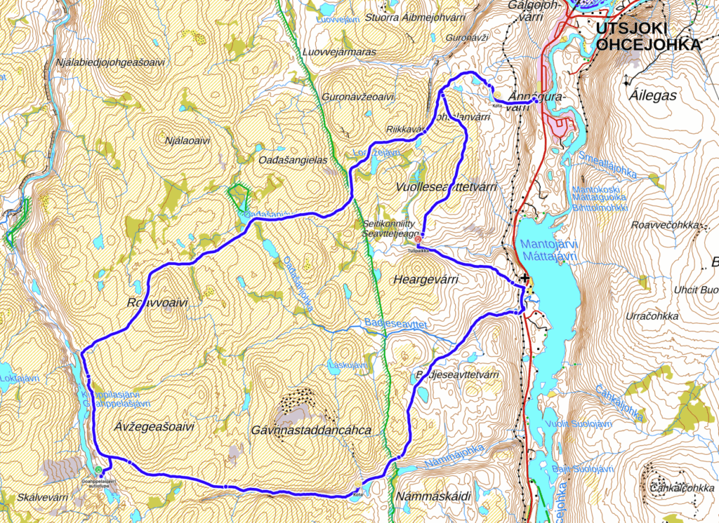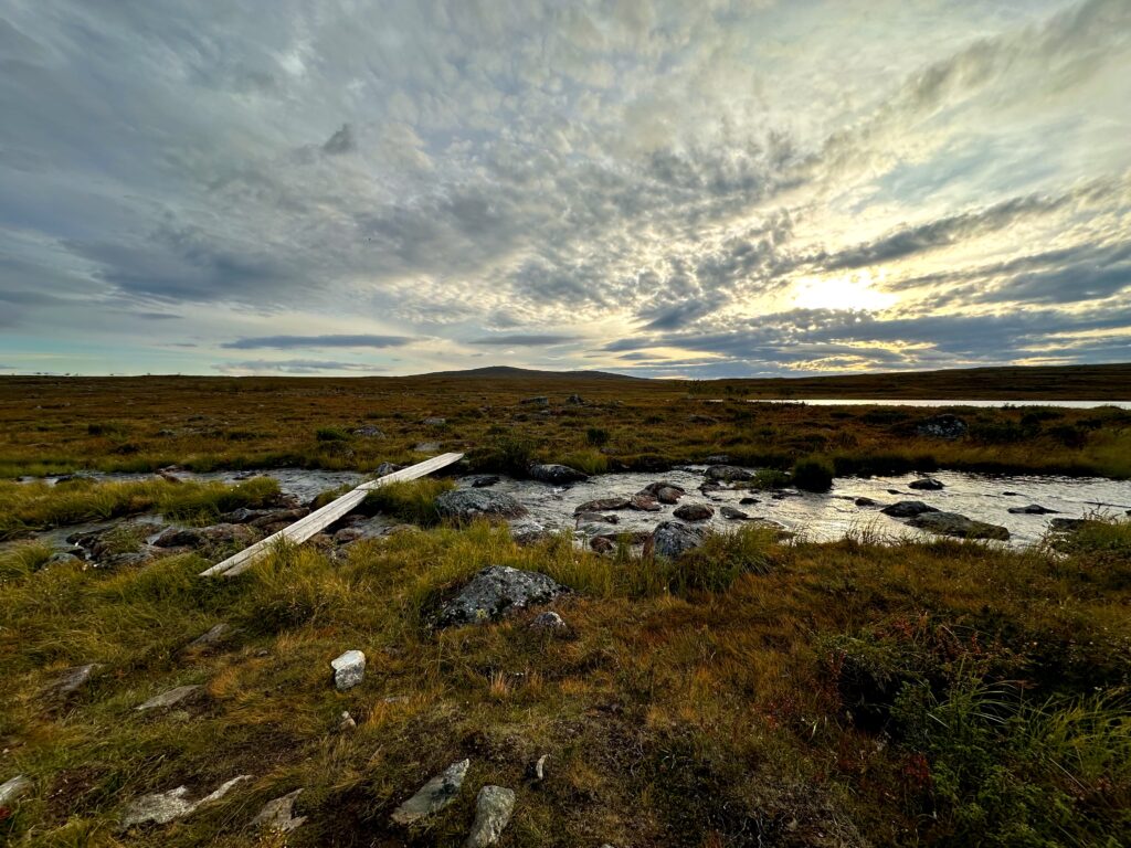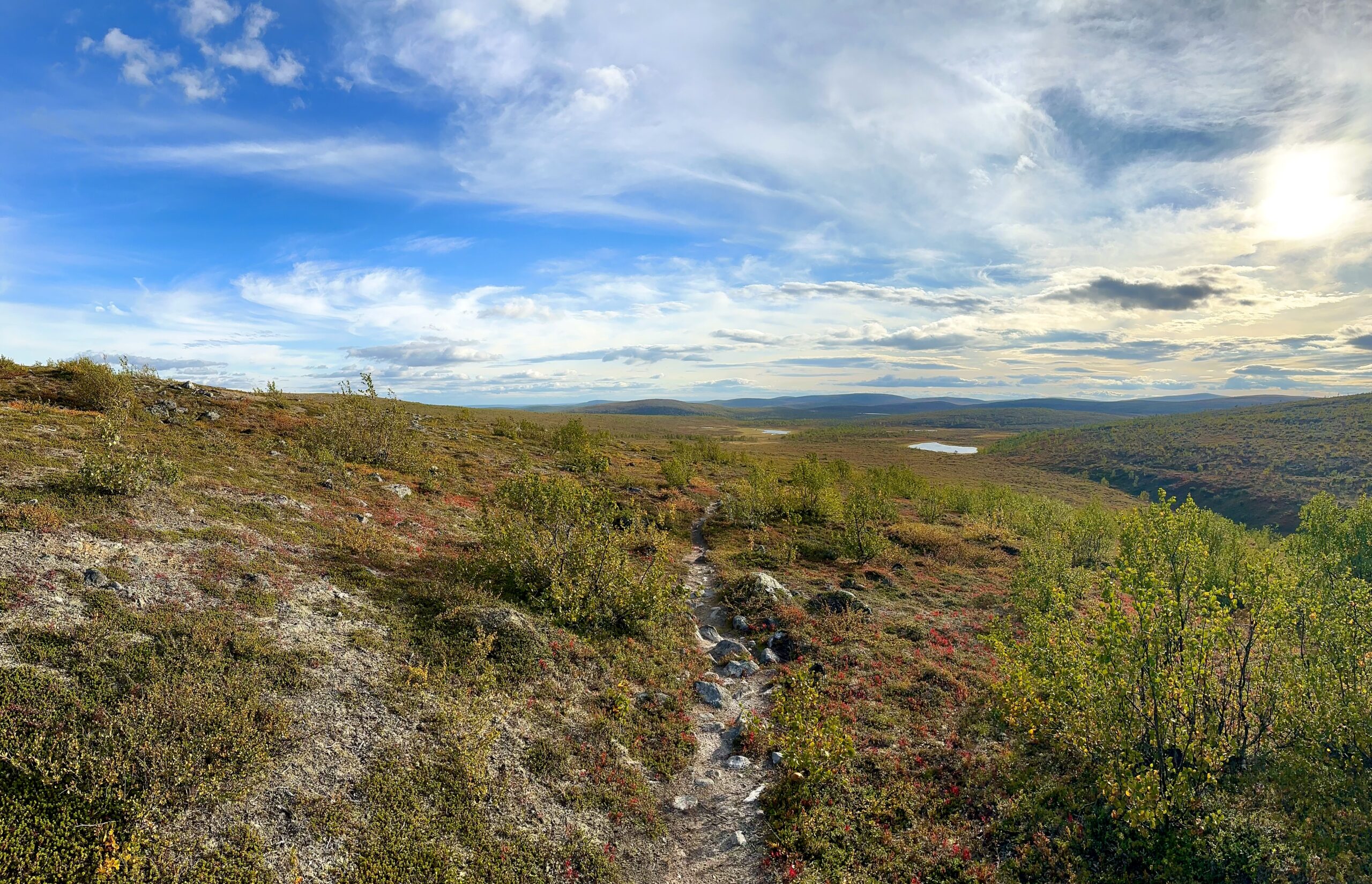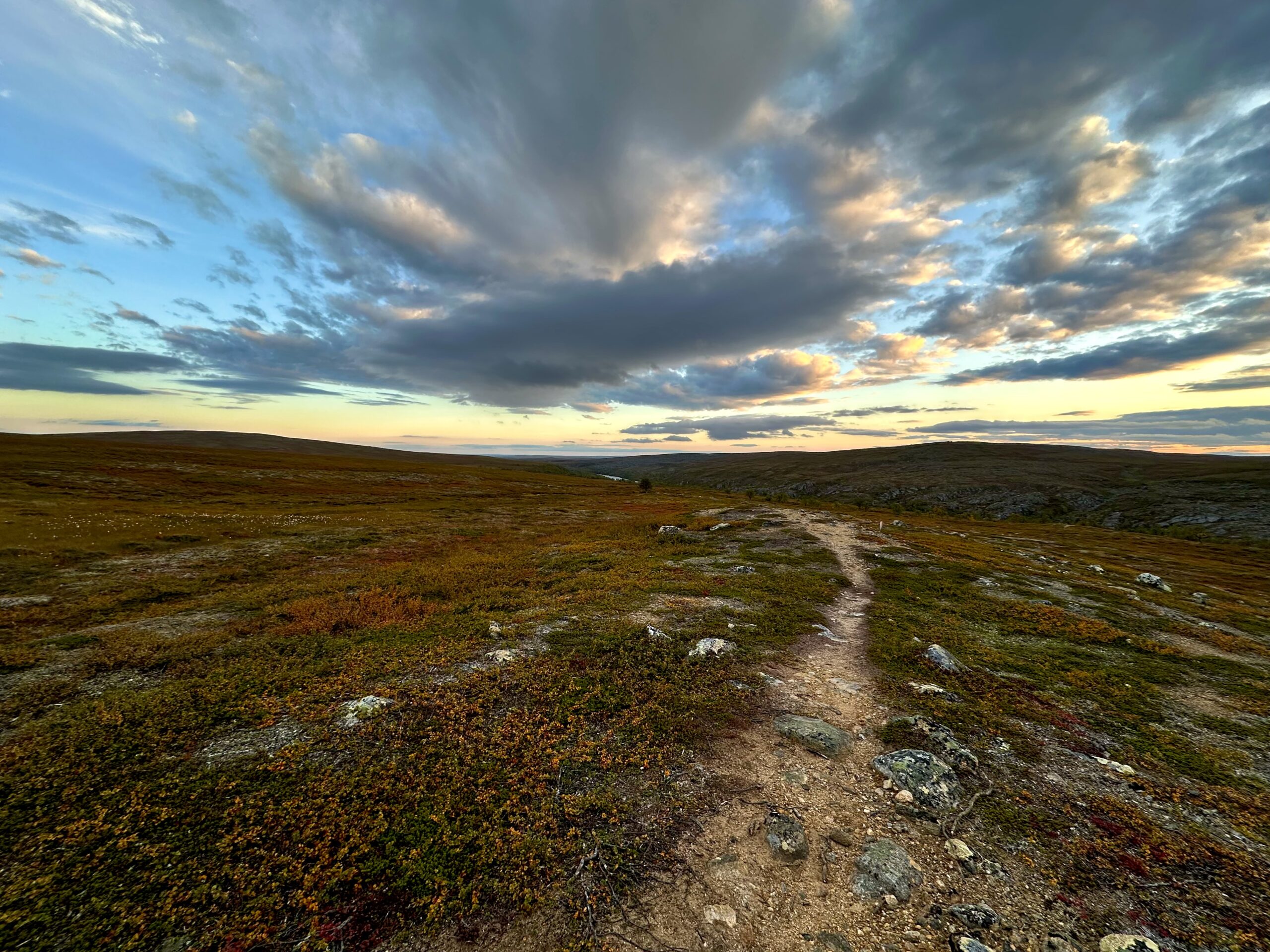 Keli oli mitä mahtavin kun perillä nousin bussista. Utsjoen kylältä hikisen ja kivikkoisen nousun tunturiin tehtyäni oli kesäisen, lähes 20 asteen lämmölle mukava pieni tuuli sopiva vastapaino. Ohitin heti nousun jälkeen vastaan tulevan Annagurran kodan ja jatkoin polkua vielä ylemmäs puuttomaan maisemaan. Hetken päästä jo tulikin risteys, jossa voi valita kumpaan suuntaan reittiä lähtee kiertämään, tästä kohtaa siis kohti Kuoppilasjärveä.
