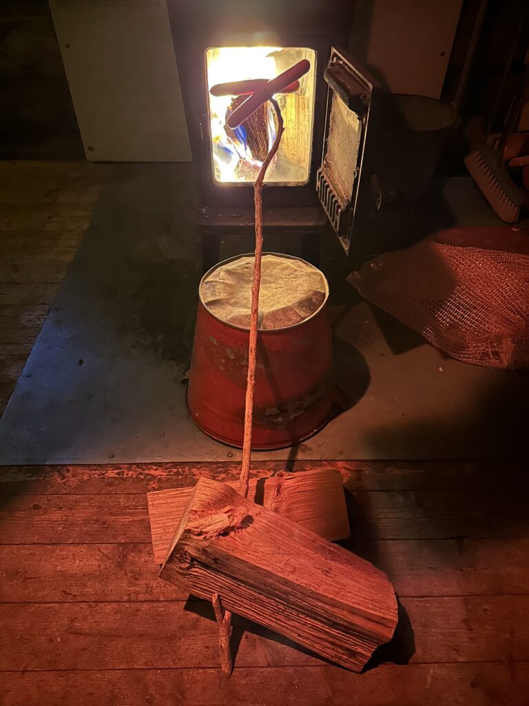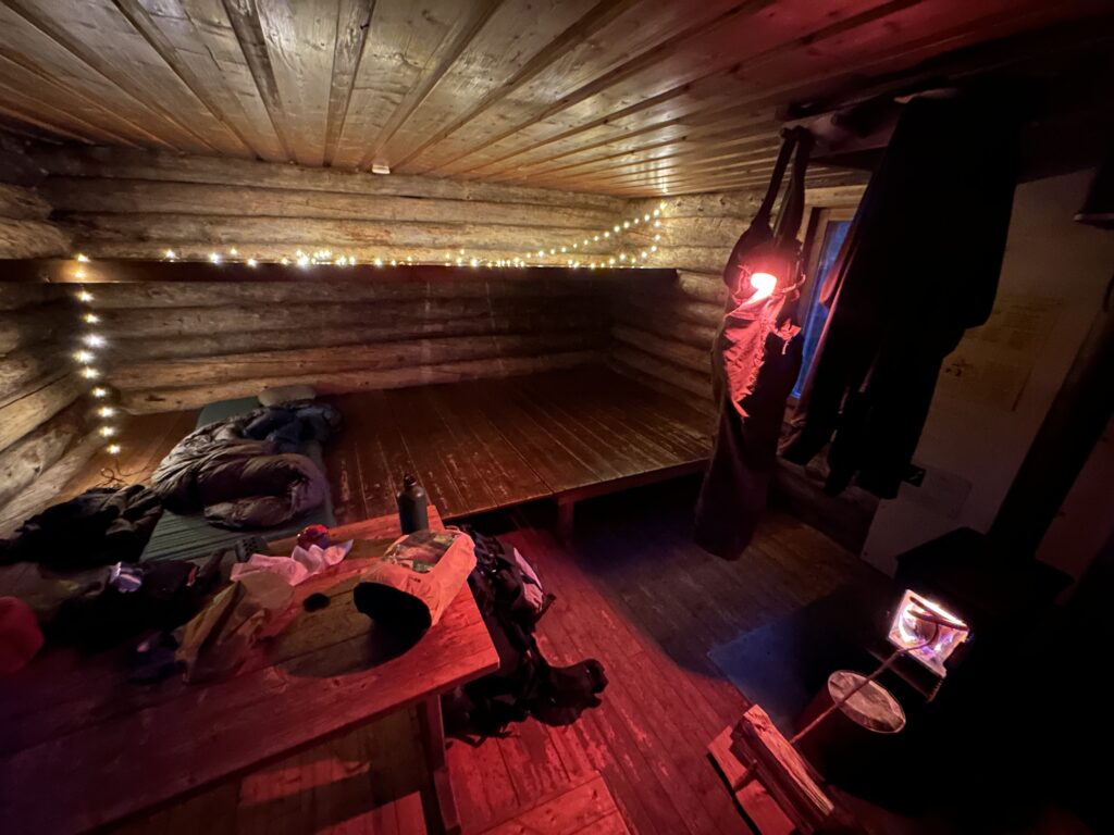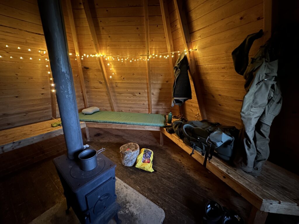 Noin 40min päästä olin vihdoin tuvalla ja mitä hienointa; se oli tyhjä. Levitin romut ja laitoin klapit kaminaan. Pikkuhiljaa pimeä alkoi hiipiä, mutta ennen mitään muuta tekemistä oli käytävä jollain tapaa pesemässä itseään. Mitään leirikenkiä tai ylityksiin dedikoituja tossukoita ei tällä reissulla ollut mukana, mutta rauhallisella kikkailulla pääsin liukkaiden kivien päällä kävelemään muutaman askeleen järveen että sai heitettyä vettä vähän päälleen. Sitten tupaan, valojen levittely ympäriinsä ja kokopäivän rinkassa kulkeneet makkarat paistumaan. Oliko mitään parempaa kuin näkkärit kinkkupasteijalla, Atria artesaanimakkarat, perään kuppi kaakaota ja puhelimeen esiladatut Last of Us S2 pari viimeistä jaksoa.