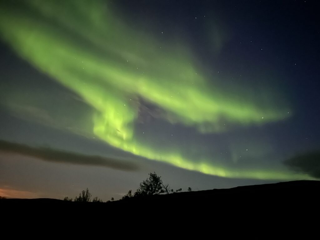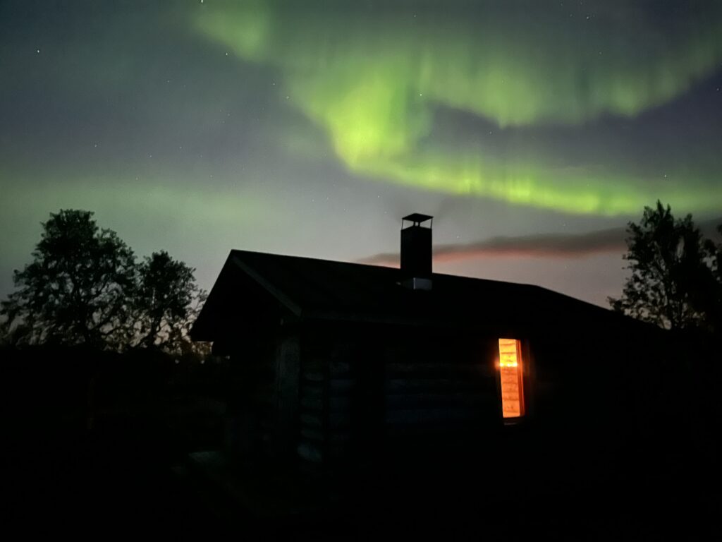 Kun olin kerennyt syömään ja hetken pötköttämään, tuli mieleen sattuisiko näkymään revontulia. Takki niskaan ja pihalle ihmettelemään. Kyllähän niitä taivaalla olikin ja ihan kunnolla. (tämä olikin sitten ainoa yö tällä reissulla kun niitä näkyi). Seisoskelin pihalla kalsarit jalassa ja takki päällä ja yritin saada puhelimella hyvää kuvaa, vaikka se kohtuu mahdotonta onkin. Onneksi oli kuitenkin aivan kesälämmöt, joten ei ongelmaa sen puolesta.