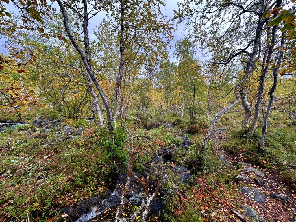 itse lähdin liikenteeseen vasta kahden jälkeen. Päivälle ei olisi kuin 6km etappi, joka siis oli seuraavalle kodalle Nammajärville (Námmájávrrit). Keli oli eiliseen verrattuna muuttunut harmaaksi ja pientä tihkua tuli vähän väliä. Säätiedotuksesta kuitenkin näkyi, että mitään kummempaa sadetta ei pitäisi ainakaan vielä hetkiin tulla. Reitti kodalle meni suurilta osin puuttomassa tunturissa ja pikku hiljaa alkoi laskea tuntureiden väliin pienen joen varteen. Viimeinen pari kilometriä matkasta olikin paikoitellen melko kivikkoista polkua koivujen seassa.