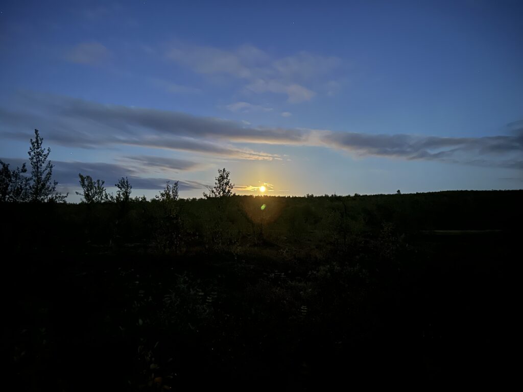 Tälläkin kertaa sain olla kodalla keskenäni. Jossain kohtaa ulos rantaan oli tullut joku kahvittelemaan pöydän ääreen, mutta seuraavan kerran kun tulin kodasta ulos olivatkin jo lähteneet. Ilta meni ilman mitään kummempia ihmeellisyyksiä ja odottelin jospa tälle iltaa tulossa ollut kuunpimennys olisi sattunut näkymään. klo 2100 jälkeen menin kodan taakse tuijottamaan itä-kaakkoon, mutta siellä jossain tunturin takana se kuu varmaan sitten oli. Joskus 2140 nurkilla kuu oli noussut sen verta, että sen näin, mutta pimennys lienee ollut tässä kohdassa jo suurilta osin ohi. Ei se mitään, pimennystä edeltänyt auringonlasku lammen taa oli varmasti ollut sitäkin hienompi.
