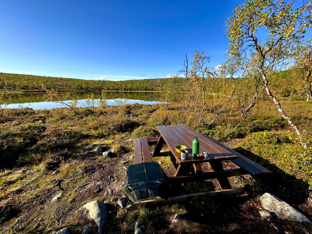 Aamulla aurinko paistoi ja ilma lämpeni nopeasti kesäisiin lukemiin yön noin 6 asteesta. Kodan vieressä järven rannassa oli perinteinen piknikpöytä, jossa kelpasikin syödä aamupalaa. Viimeiselle varsinaiselle vaelluspäivälle olisi noin reilut 13km matkaa takaisin lähes reitin alkuun Annagurran kodalle, jonka ohitse olin ekana päivänä mennyt. Reitillä olisi kartan mukaan yksi joen ylitys, jossa olisi oikein kahluuvaijeritkin. Tämän jälkeen se käy 4-tien varressa, josta se lähtee takaisin tunturiin Härkävaaran tulipaikan kautta.