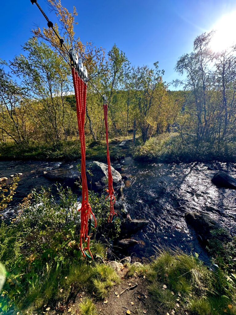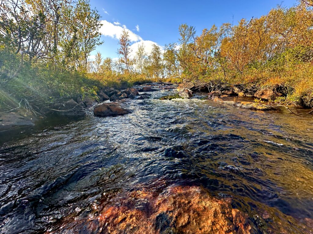Olin ajatellut meneväni Härkavaaralle asti lounastamaan, mutta jo ennen 4-tietä alkoi energiat olemaan niin lopussa, että syöminen oli pakko hoitaa tien varressa olevalla parkkipaikalla kun siihen asti pääsin. Ongelma oli vain kesken loppunut vesi, mutta matkaa tulipaikalle oli tuosta vain 2km, joten taistelin kevyen ruokailun jälkeen polkua eteenpäin, ennen kuin vastaan tuli Vuolleseavttet -joki. Härkävaarassa vedinkin sitten lounas nro.2, koska hapotus oli kova.