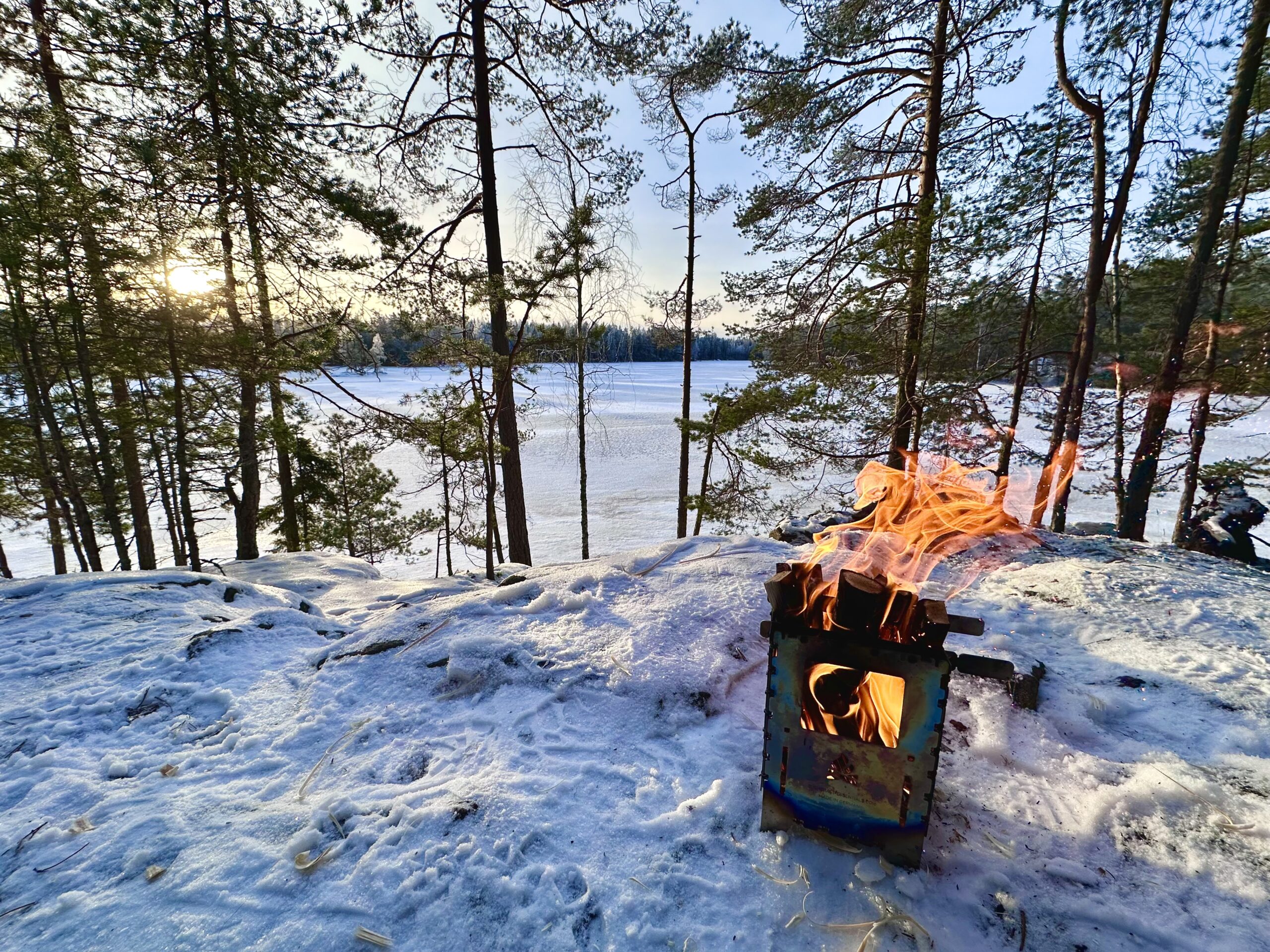 Kiersin pienen järven koilliskulmaan kalliolle, jossa aurinko paistoi suoraan silmään. Nakkasin tuolin pystyyn ja lykkäsin risukeittimen tulille. Olin hankkinut vanhaan Zippo-sytkän kuoriin ”modernin” butaani-insertin, joka oli ensimmäistä kertaa mukana, mutta olinpa unohtanut, että eipä noilla vehkeillä juuri mitään tee kun pakkasta on vähäkin enemmän. Taitaa vaan perinteiset tulitikut olla (ainakin talvella) paras ratkaisu. Teen keittelyn ja nakkien lämmittämisen jälkeen alkoikin aika pikaseen olla kohmeinen olo, pakkaskiintiöni oli selvästi tullut täyteen.