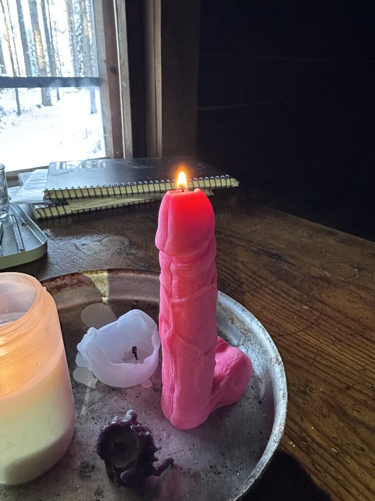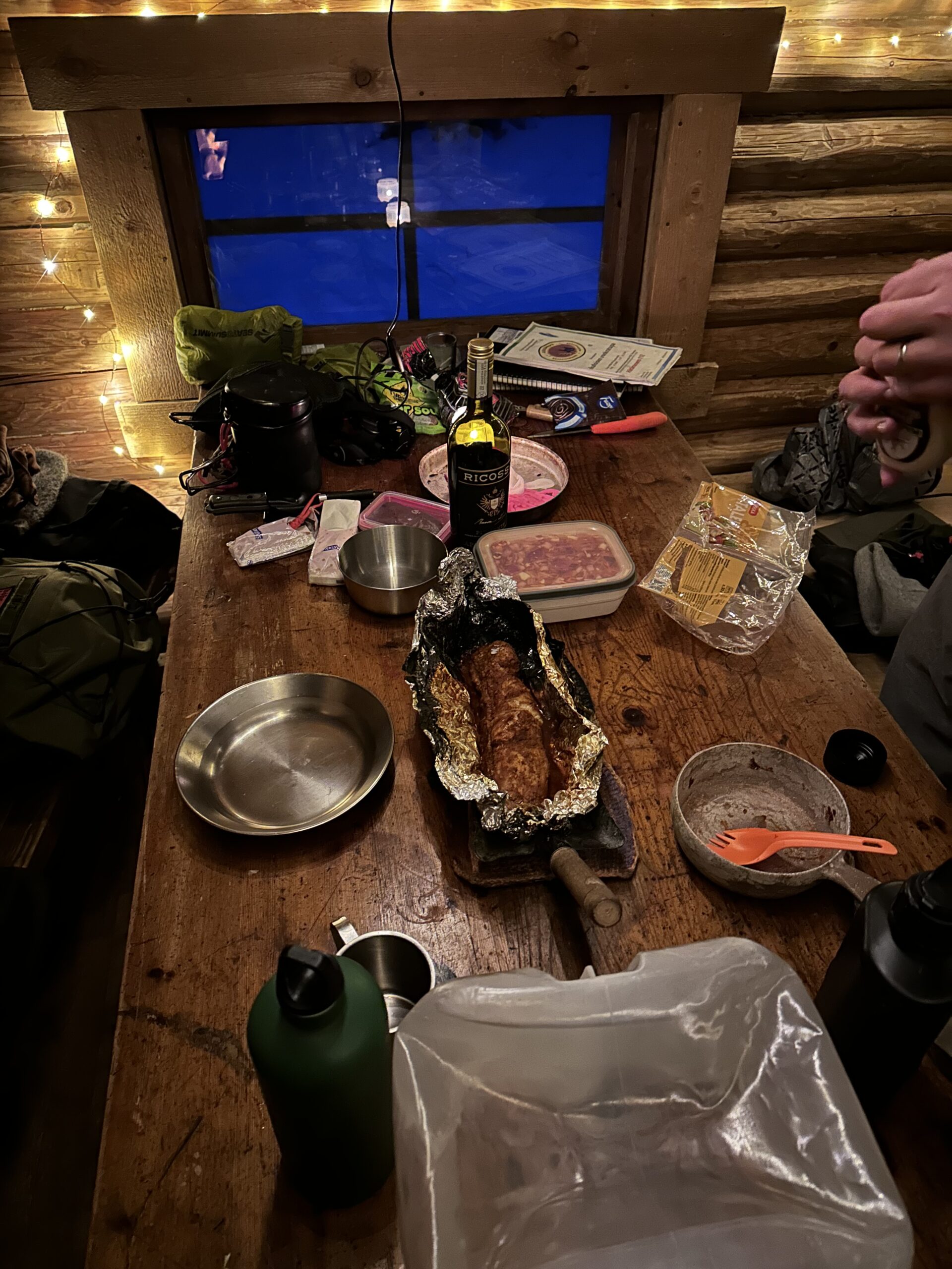 Pimeä tuli ja pikku hiljaa oltiin illassa. Lihakin saatiin puolentoista tunnin pyörittelyn jälkeen valmiiksi ja oli aika siirtyä jumittamaan sisätiloihin. Viimeinen pinta lihaan oli tarkoitus ottaa nakkaamalla foliopötkö hetkeksi lähes suoraan hiilille, parin klapin päälle. Hetken se siinä pysyikin, mutta nopsaan onnistuttiin tipauttamaan liha klapien päältä suoraan ahjoon. Noin 2 sekunnin miettimisen jälkeen tuvan tuhkalapio tarjoutui sopivaksi työkaluksi lihan turvaan saattamiselle. Samalla tuhkalapio toimi näppäränä tarjoiluastiana lihalle myös pöydässä. Ruokaa ja viiniä, tämän jälkeen loppuilta menikin aikalailla pötkötellessä. Illan mittaan tietysti vielä upposi kuppi kaakaota ja jäätävä lakupussi.