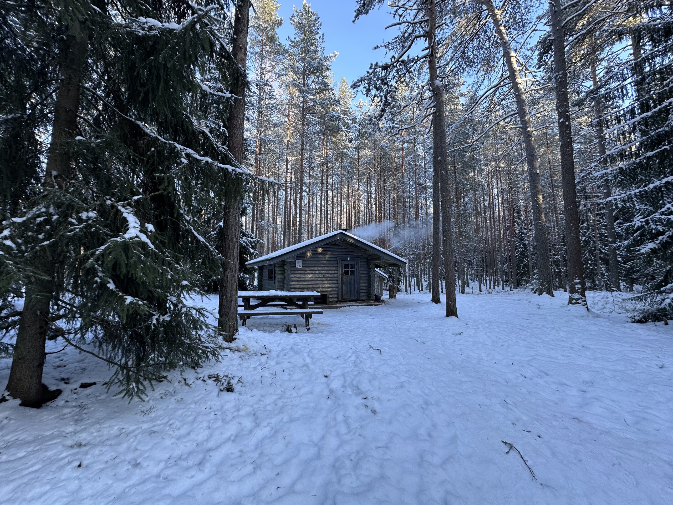 Pääsimme parkkipaikalle hieman klo 1400 jälkeen ja tuvan varaus alkoi samaan aikaan. Pitihän kopin varauksesta tietysti ottaa ilo irti ”koko rahalla”. Kävelyä ei kestänyt kuin noin 10min, jonka jälkeen pääsi toteamaan mökin pienuuden. Monesti vuokratuvat tuppaavat olemaan autiotupia isompia, mutta nyt oltiin 15 neliömetrin komerossa. Noh, vaikka pää meinasi osua kattoon ja ovesta oli kuljettava about kaksin kerroin taitettuna, ainakin pieni koppi lämpeni nopeasti. Lämmitystähän tarvi, sillä pihalla oli noin -14 astetta pakkasta.