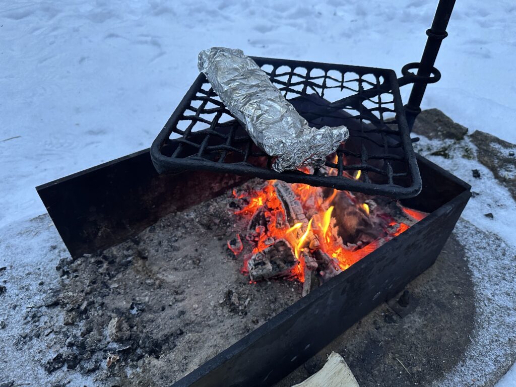 Kun kamina oli saatu kunnolla jauhamaan, laitettiin myös pihanotski tulille lihan paistoa varten. Possun sisäfileeseen pyöräytettiin rubit pintaan ja sitten Gochujang -chilitahnat päälle. Sitten folioon ja ritilälle tulen päälle. Arvaus oli, että lihalla hetki tulisi menemään kun lämpötila oli mikä oli. Lihaa odotellessa korkattiin punaviini sekä kinkut ja juustot, ja laitettiin kämppä täyteen valoja.