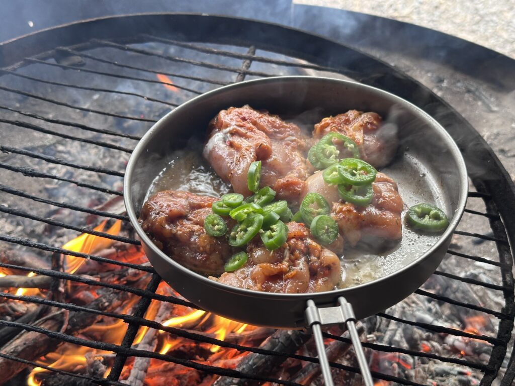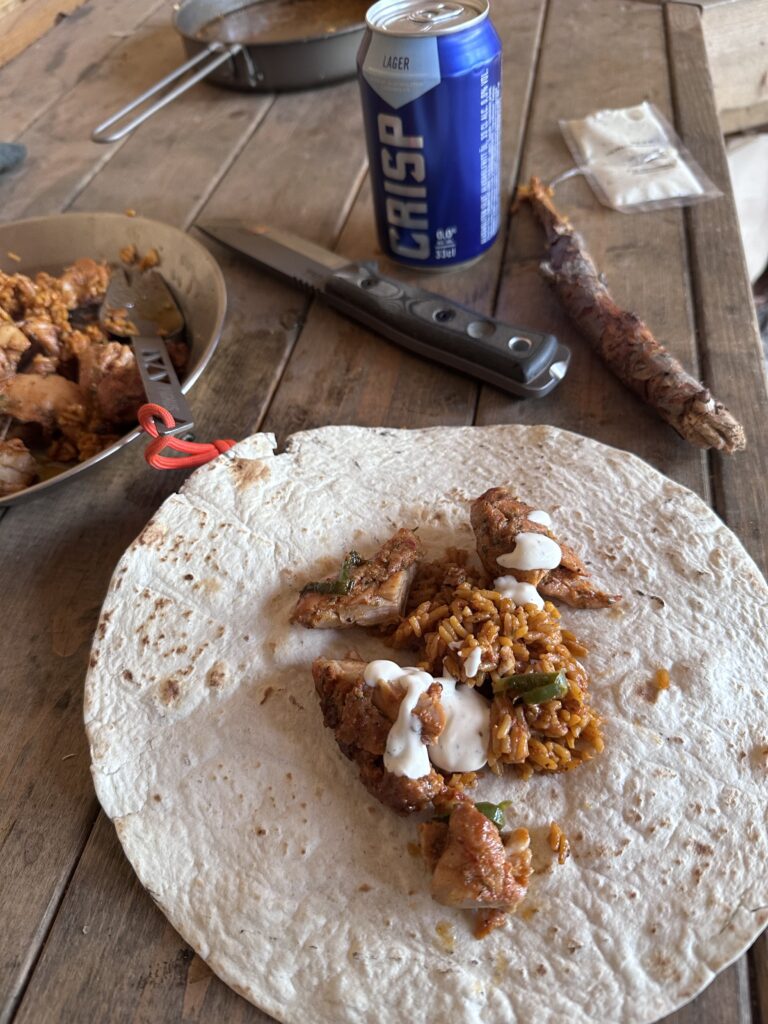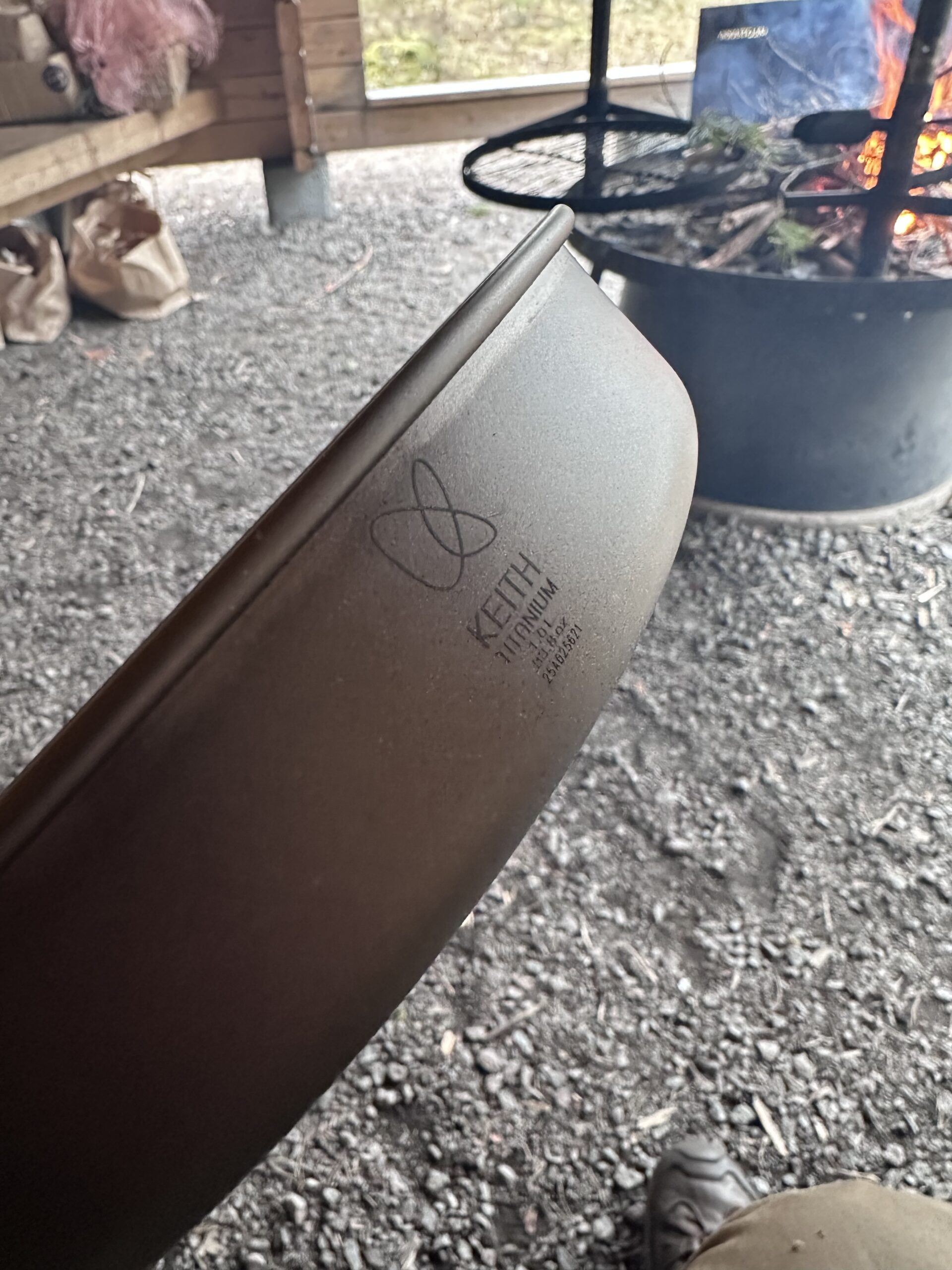 Pientä skeptisyyttä oli titaanipannuun aluksi, mutta homma lähti paljon odotettua näppärämmin liikenteeseen. Lämpöähän pannu varaa tasan ei yhtään, joten tasainen liekki oli tärkeä. Pientä keppiä sai olla syöttämässä liukuhihnalta lisää. Kuin ihme ja kumma; mitään ei palanut, mitään ei kaatunut maahan, eikä mitään roiskunut päälle. Suoritus siis 6/5 ja sitten syömään. Nykynuoriso ei kuulemma enää edes juo viinaa, joten hyppäsin itsekin aallonharjalle ostamalla 0% oluen ruokajuomaksi. Tänä päivänä nuo ei onneksi maistu samalta saippuavedeltä kuin 15v sitten.